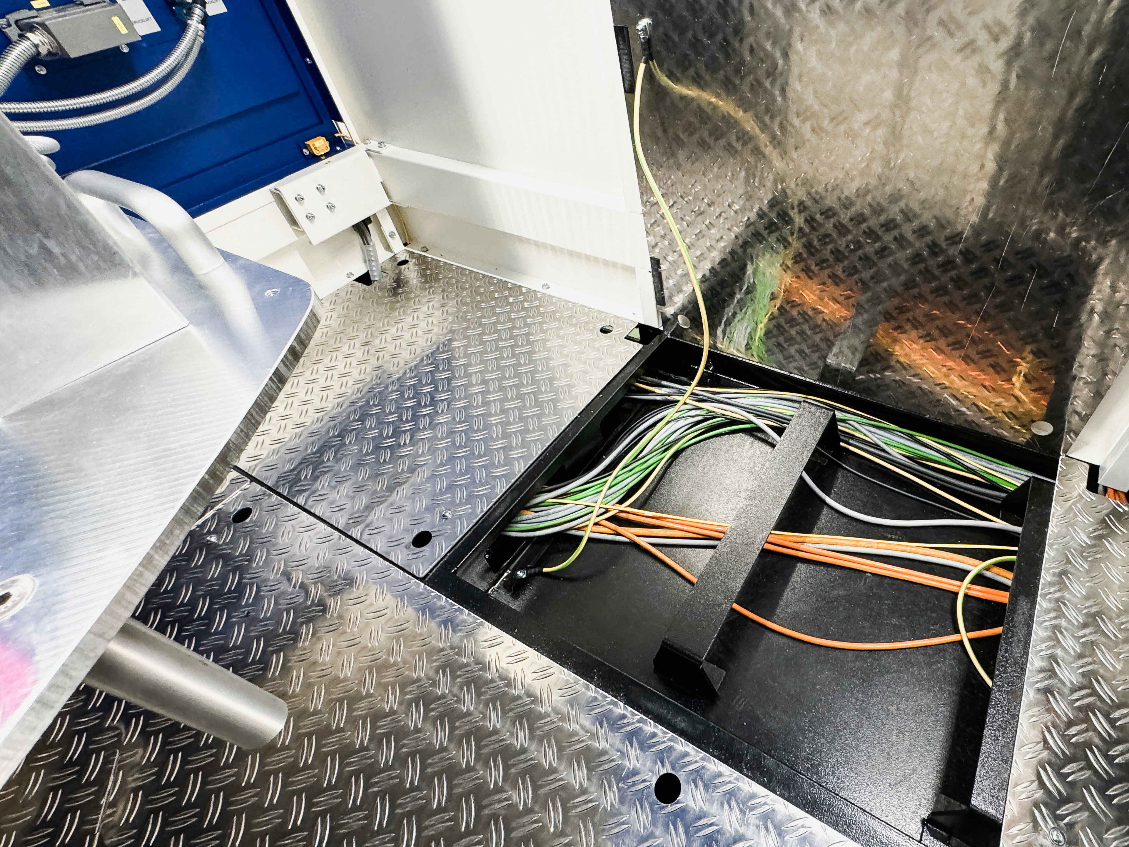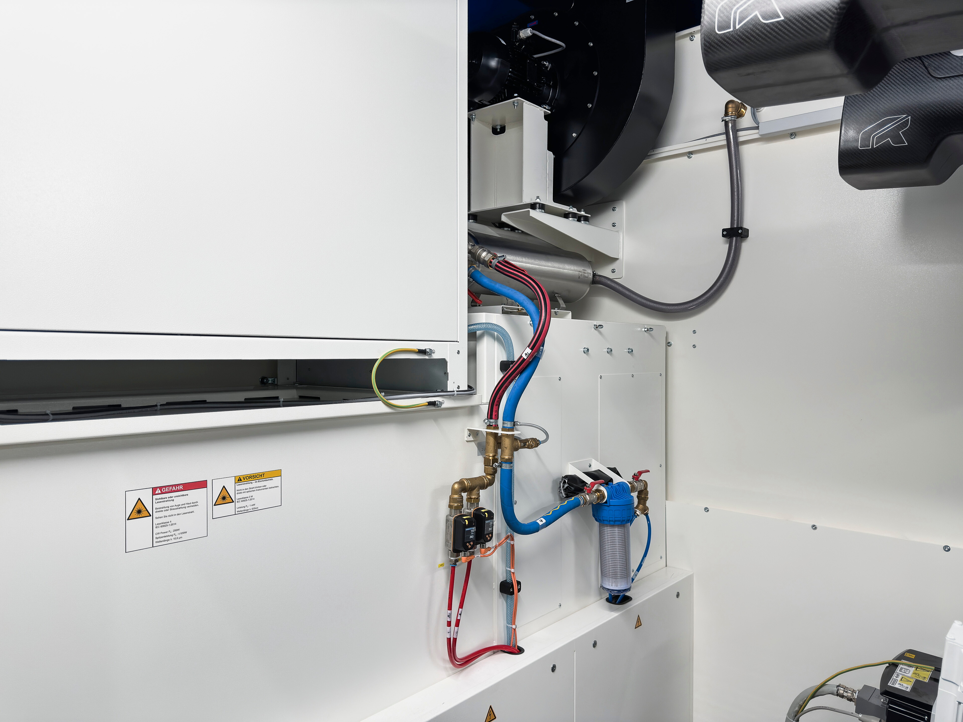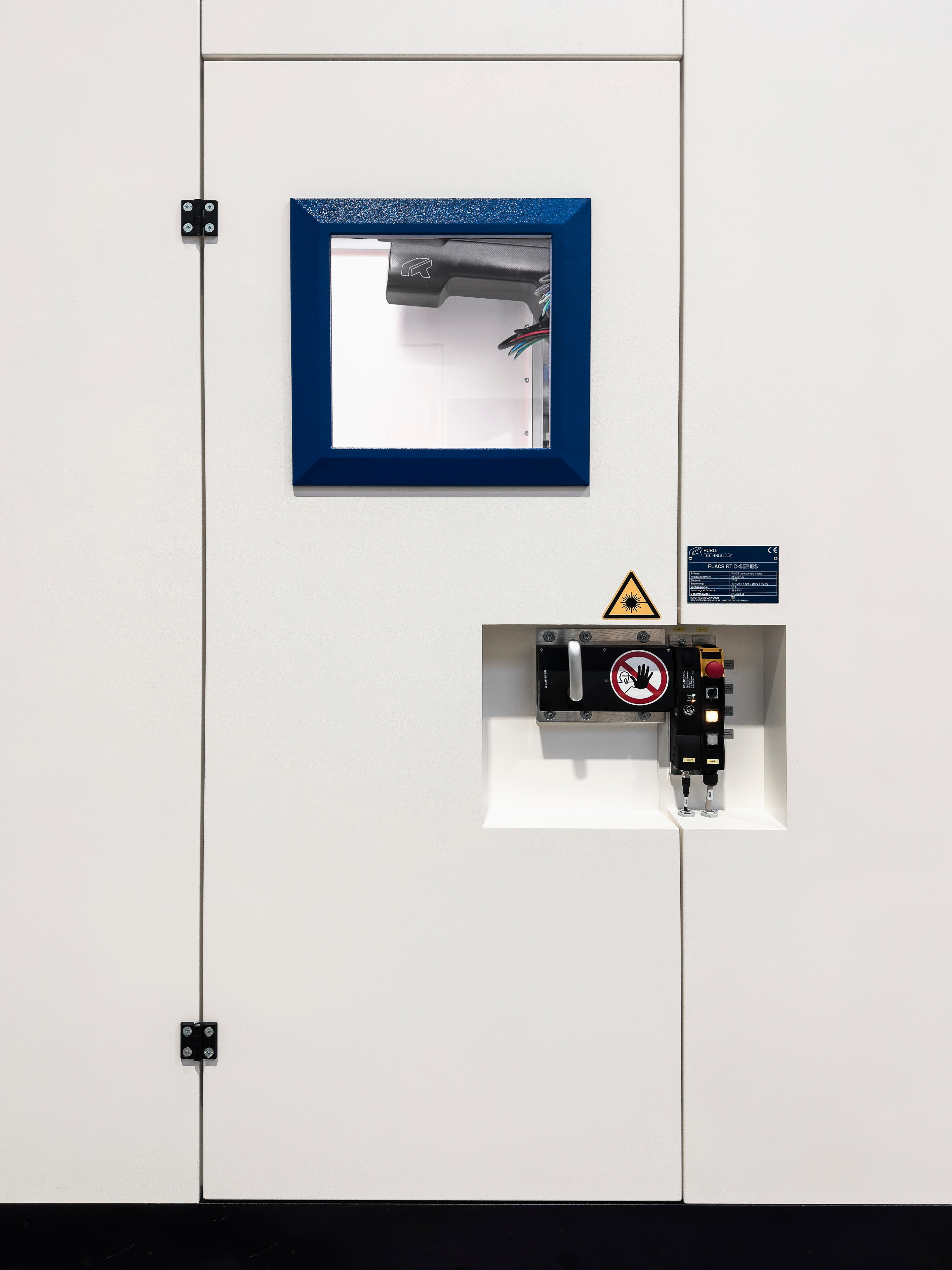 Die robuste, aus Stahlblech gefertigte Schutzkabine gewährleistet umfassenden Schutz vor Laserstrahlen und entspricht außerhalb der Kabine der Laserklasse 1. Seitlich befindet sich eine Zugangstür mit Fenster, die einen schnellen Zugang zu allen wichtigen Komponenten für Wartungsarbeiten ermöglicht.