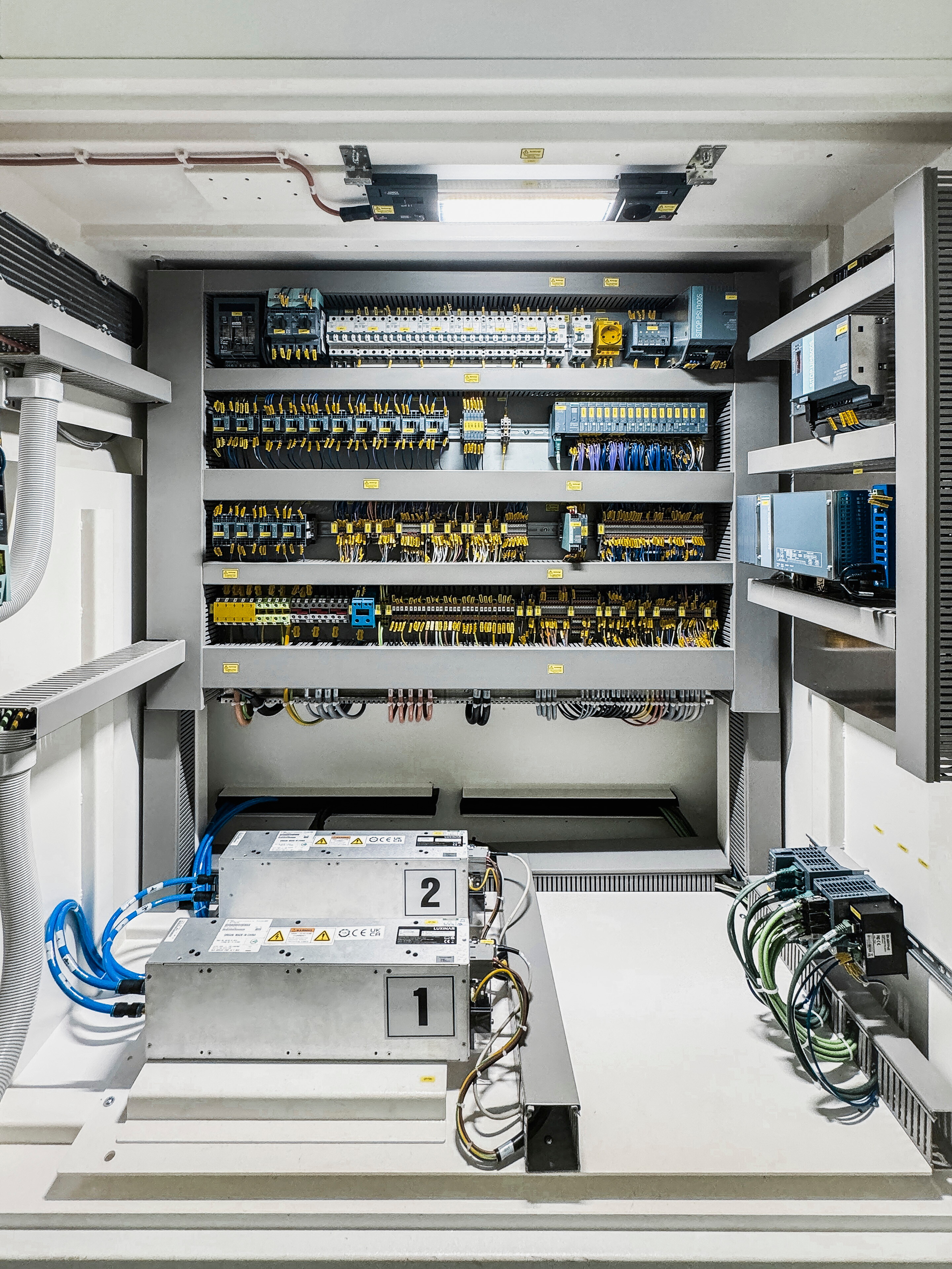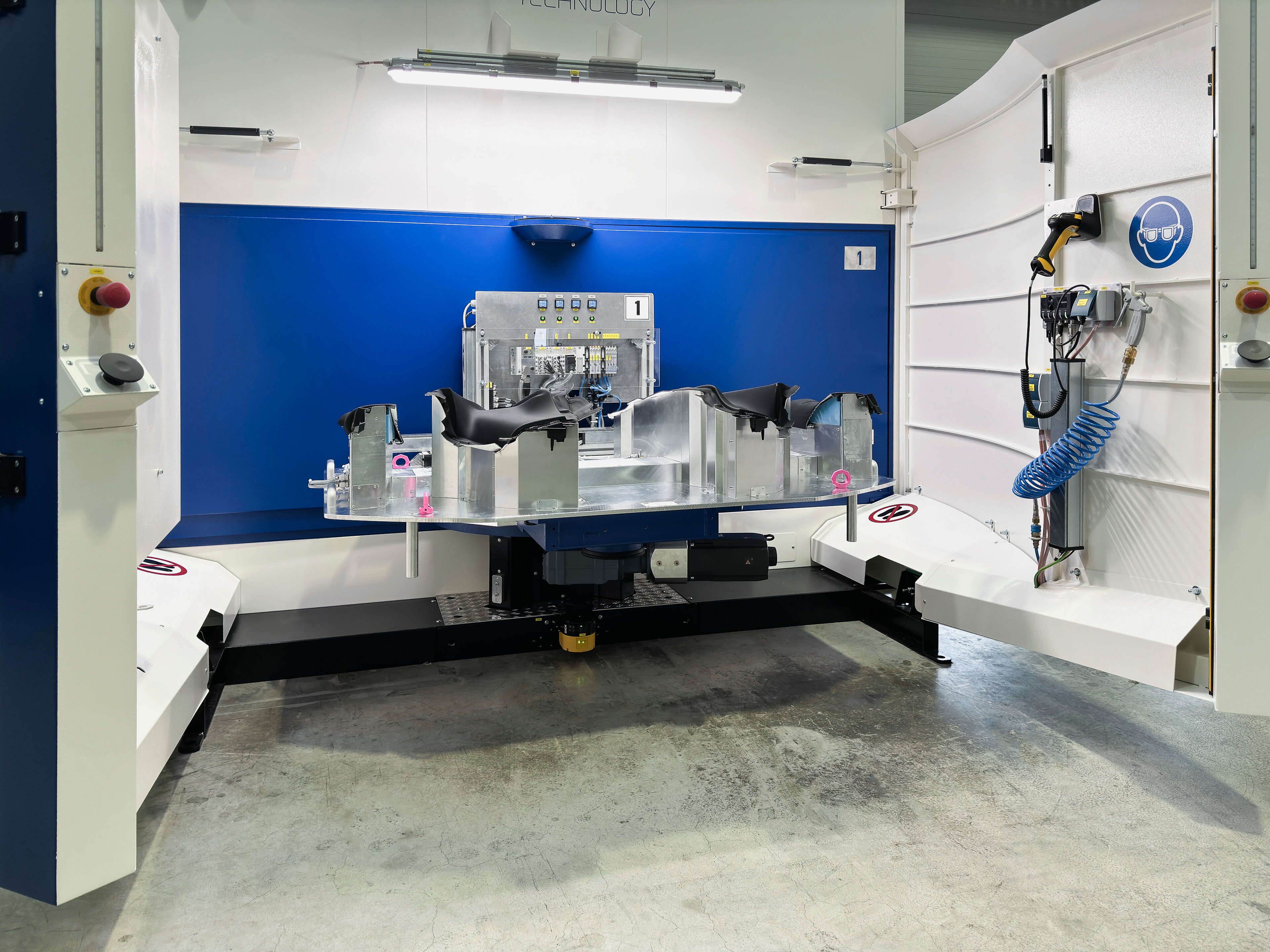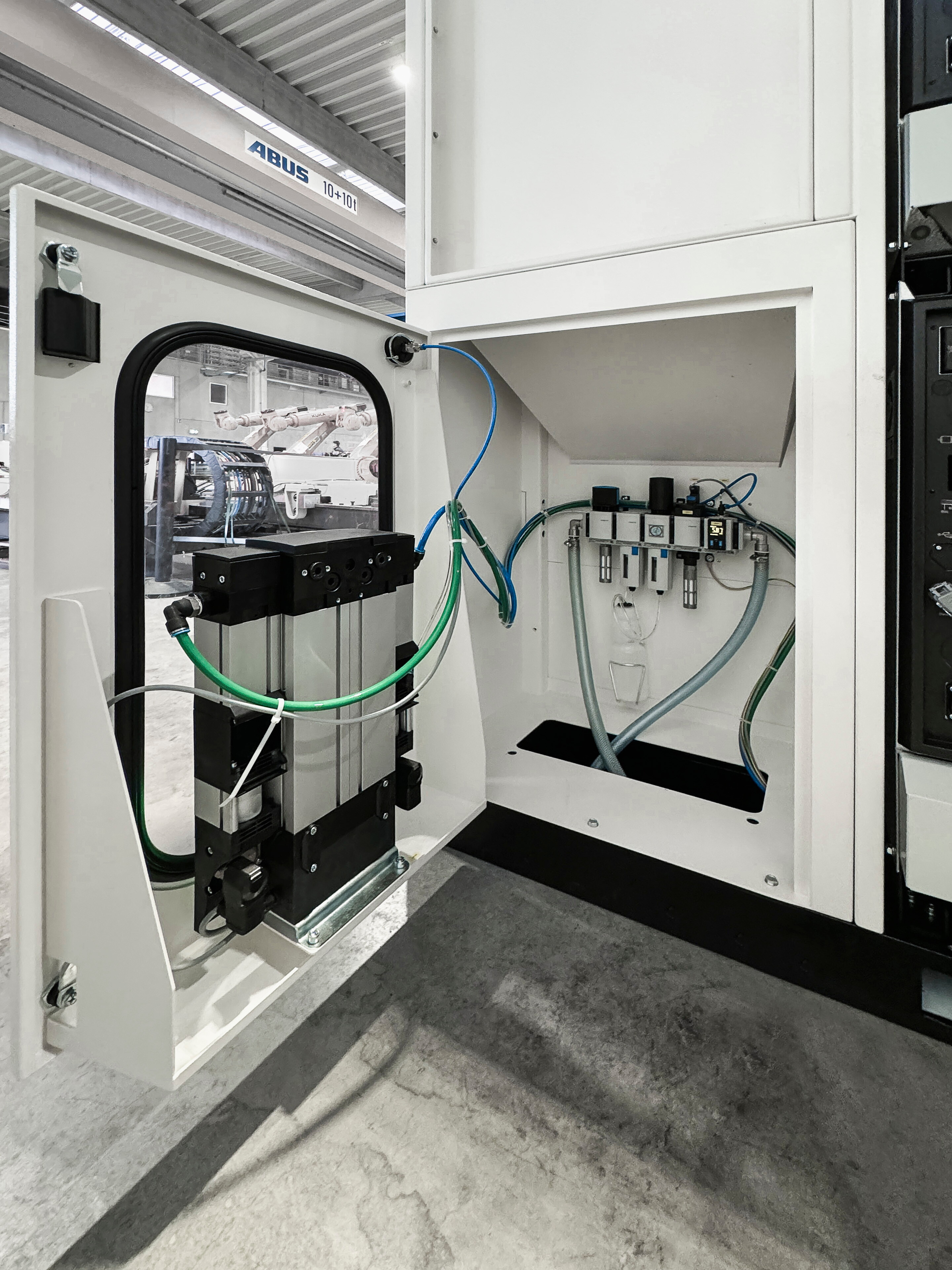 Die robuste, aus Stahlblech gefertigte Schutzkabine gewährleistet umfassenden Schutz vor Laserstrahlen und entspricht außerhalb der Kabine der Laserklasse 1. Seitlich befindet sich eine Zugangstür mit Fenster, die einen schnellen Zugang zu allen wichtigen Komponenten für Wartungsarbeiten ermöglicht.
