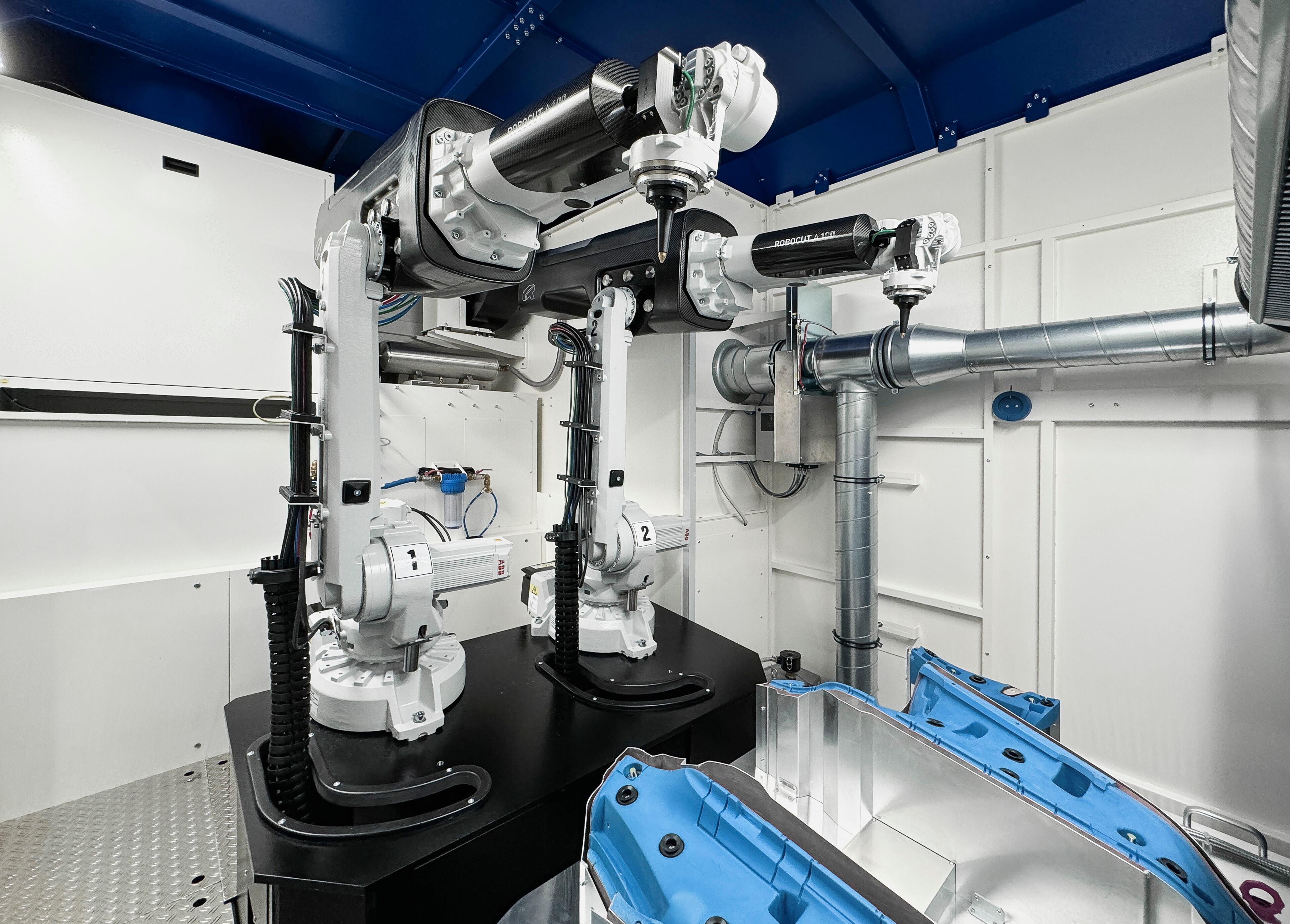 In der Laserschneidanlage FLACS RT C-Series kommt unser hauseigener Laserroboter ROBOCUT A100 oder A1000 zum Einsatz. Dieser kann je nach Anforderung mit einem integrierten CO₂-Laser (100–1000 W), einem CO₂-Laser mit externem Strahlarm (bis 2 kW) oder einem Faserlaser (bis 2 kW) ausgestattet werden. Abhängig von der benötigten Taktzeit wird die Anlage mit einem oder zwei Robotern konfiguriert.